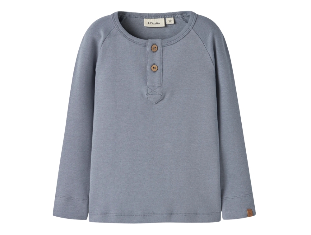 Blouse in a blue shade (tradewinds) from Lil' Atelier with grandad style button placket and decorative wooden buttons at the front.
