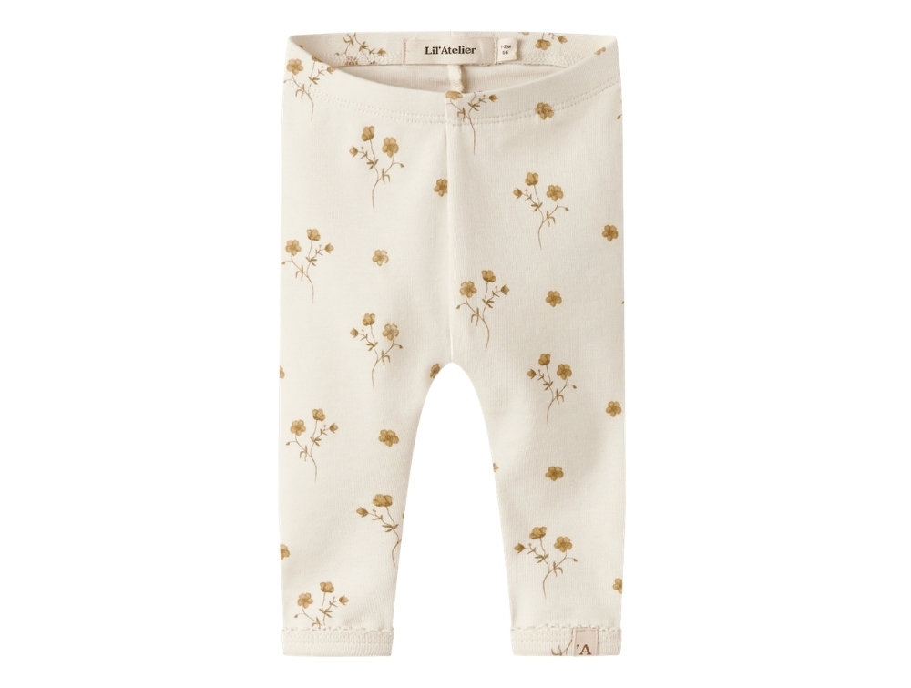 Leggings in an off-white shade (coconut milk flower yellow) from Lil' Atelier with small floral print in warm golden tones.