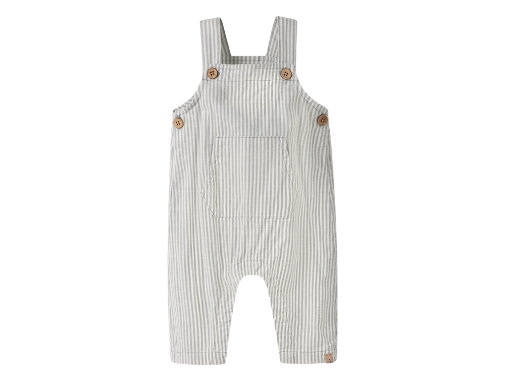 Overalls in an off-white shade (coconut milk) from Lil' Atelier with fine narrow stripes and a classic front pocket.