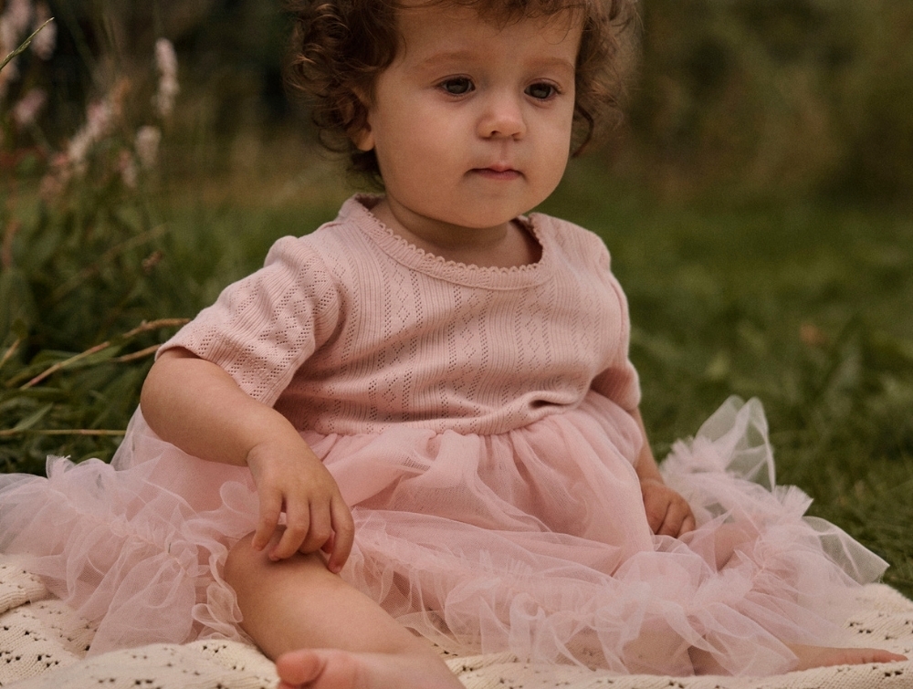 The bodysuit part is made from 70% cotton (organic) and 30% polyester (recycled), offering a soft feel and freedom to move. The tulle skirt adds a light layer and extra volume to the skirt.