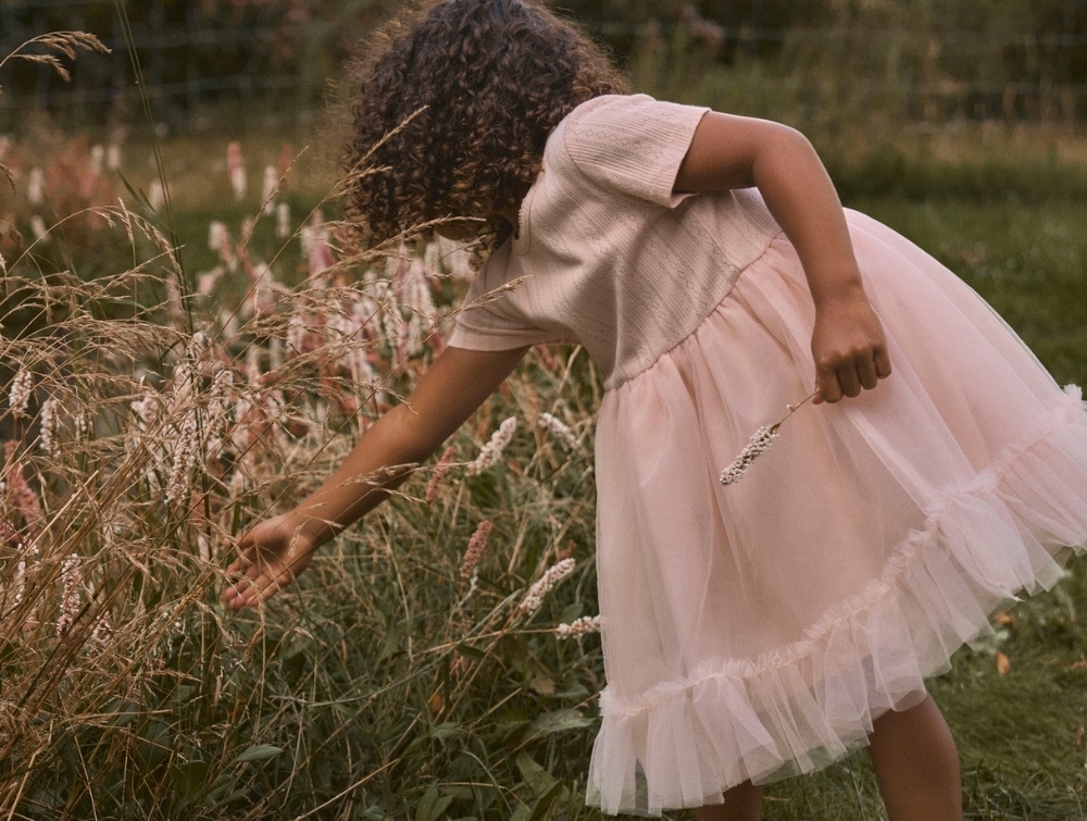 Dress in a light pink shade (peach whip) from Lil' Atelier with a pointelle top and a light tulle skirt.
