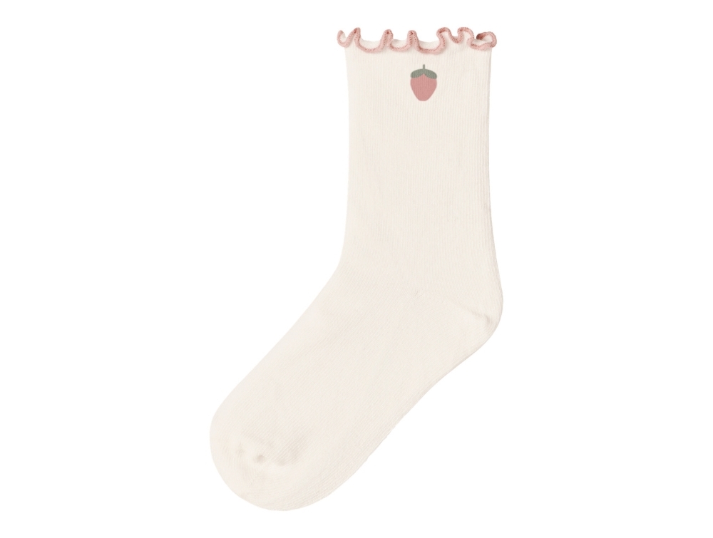 Socks in an off-white shade (coconut milk) from Lil' Atelier with a small strawberry motif and scalloped edge at the top.