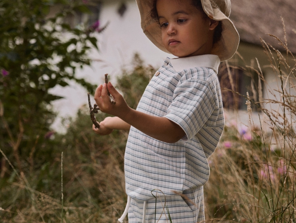 Polo t-shirt in an off-white shade (coconut milk) with light blue stripes (dusty blue)  from Lil' Atelier.
