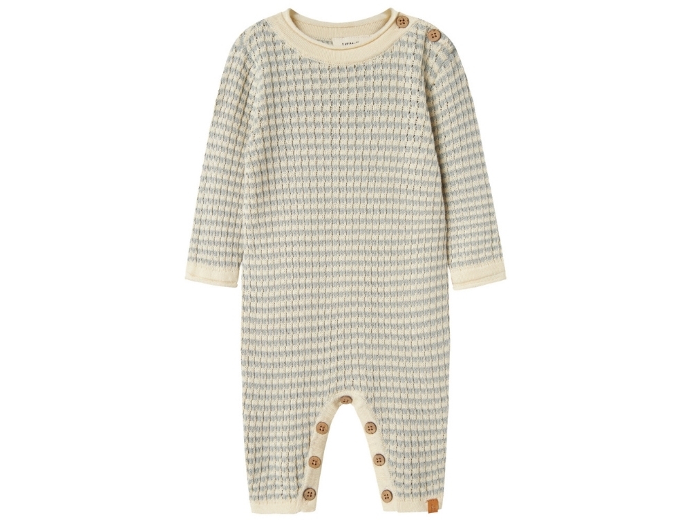 Jumpsuit in dove blue and off-white shade from Lil' Atelier with buttons along the legs. A soft and comfortable style for little ones with a lovely woven texture.