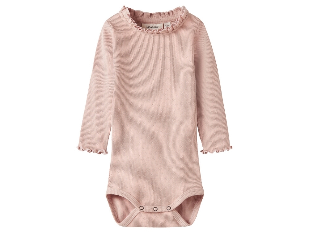 Ribbed baby body in soft pink shade from Lil' Atelier. The body features long sleeves, a round neckline with a cute frill, and snap buttons between the legs for easy dressing.