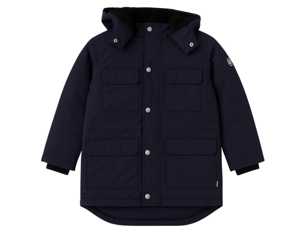 This winter jacket, the Winter Jakuni Jacket, is designed with materials that balance style and function. It's made from 100% nylon, both on the smooth and rustic outer shell and the super-soft teddy lining inside. The jacket is long, extending down to the buttocks, and has a regular fit that is straight up and down, providing a modern and comfortable style.
