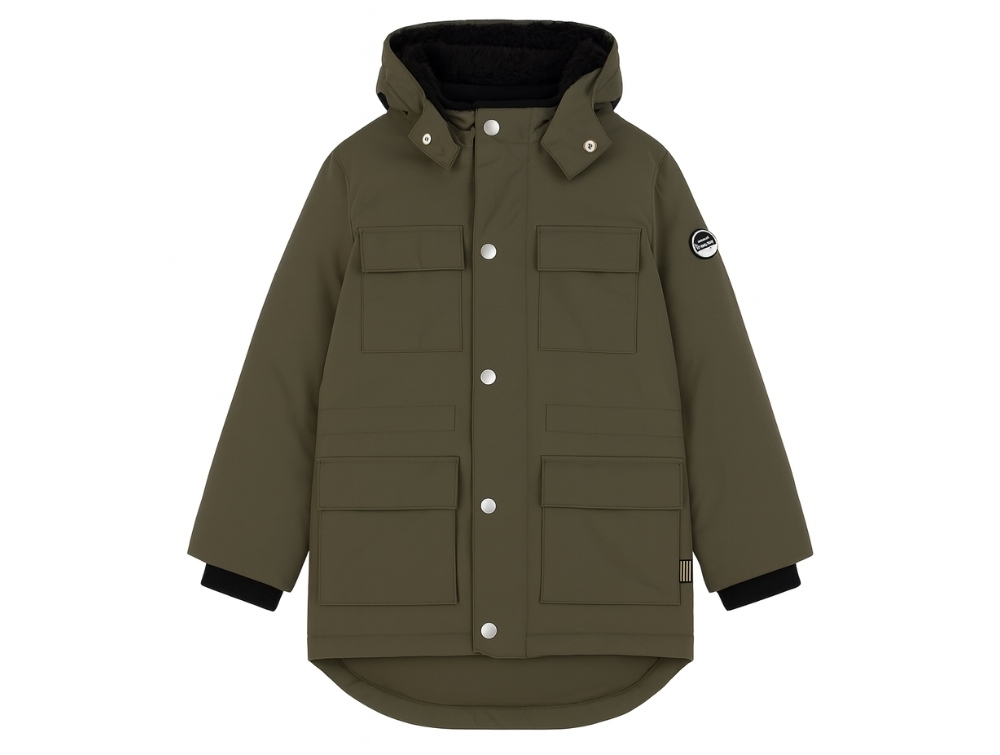 This winter jacket, the Winter Jakuni Jacket, is designed with materials that balance style and function. It's made from 100% nylon, both on the smooth and rustic outer shell and the super-soft teddy lining inside. The jacket is long, extending down to the buttocks, and has a regular fit that is straight up and down, providing a modern and comfortable style.