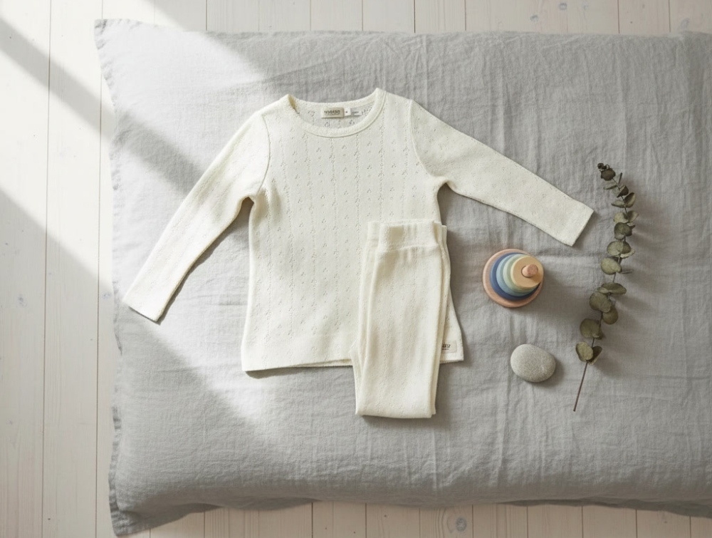 The set features a pointelle pattern and is made from 50% organic cotton and 50% modal.