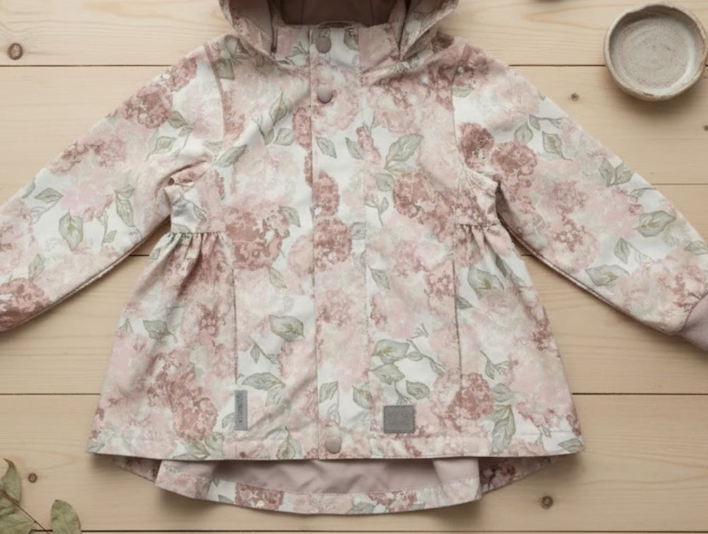 Adorable transitional jacket with floral print from MarMar. The jacket features a detachable hood with snap buttons.