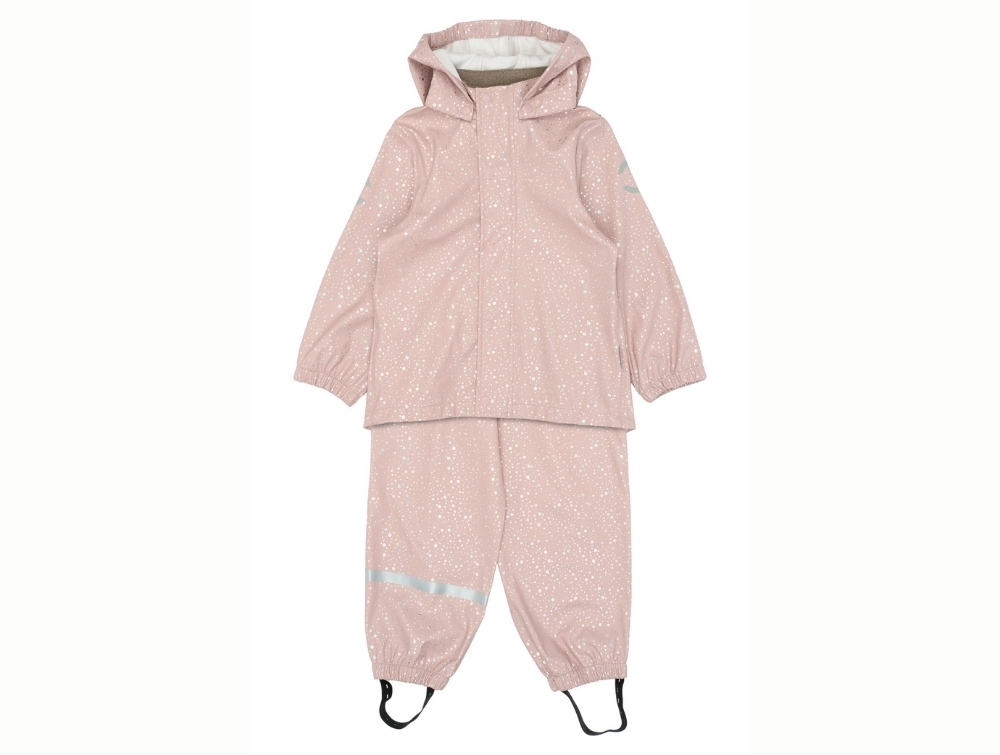 Rainwear set in soft pink (Adobe Rose) from Mikk-line featuring a glitter all-over print that sparkles in the light.