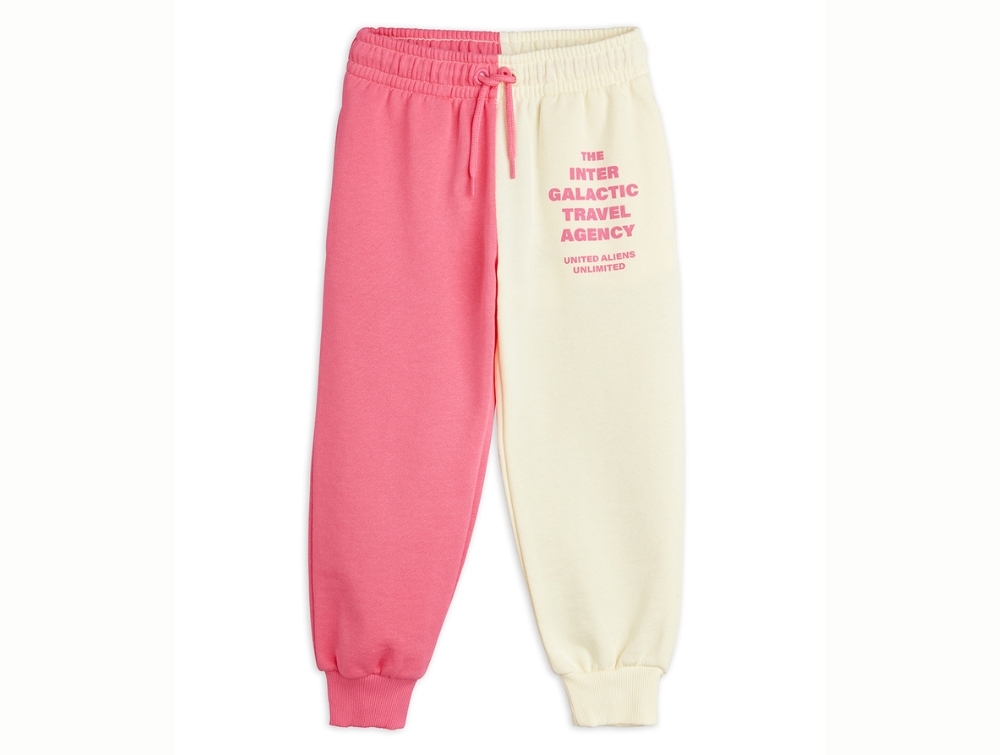 Sweatpants in a split colour (multi) design from Mini Rodini with “The Intergalactic Travel Agency” print on the leg.