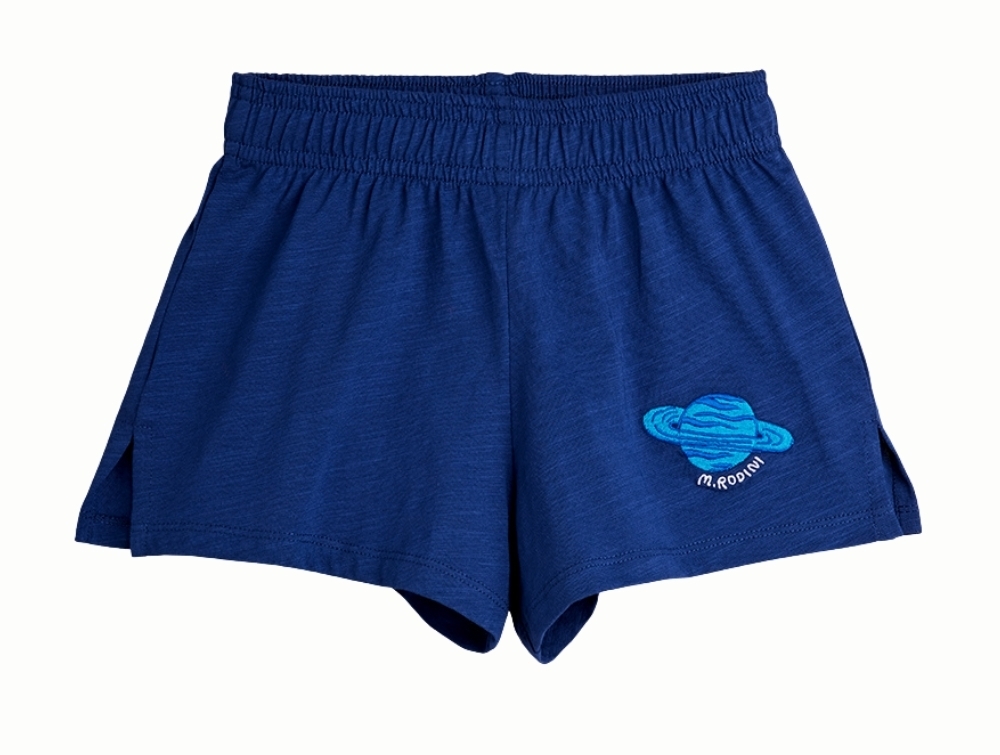 Shorts in a blue from Mini Rodini with a small planet embroidery on the leg.