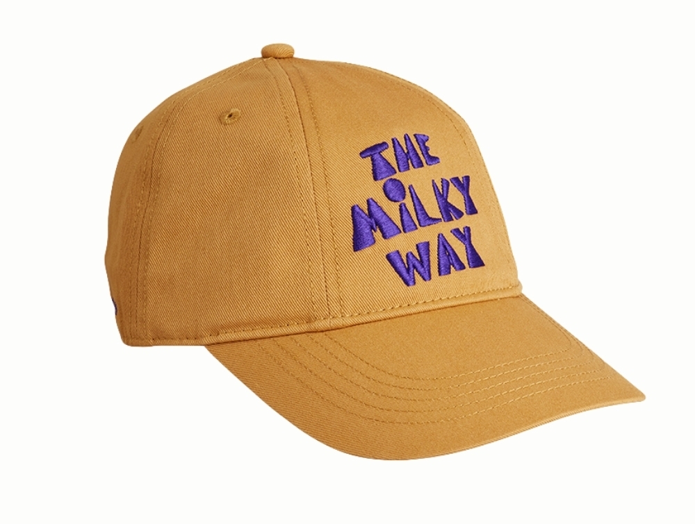 Cap in a beige shade from Mini Rodini featuring embroidered “The Milky Way” text on the front.