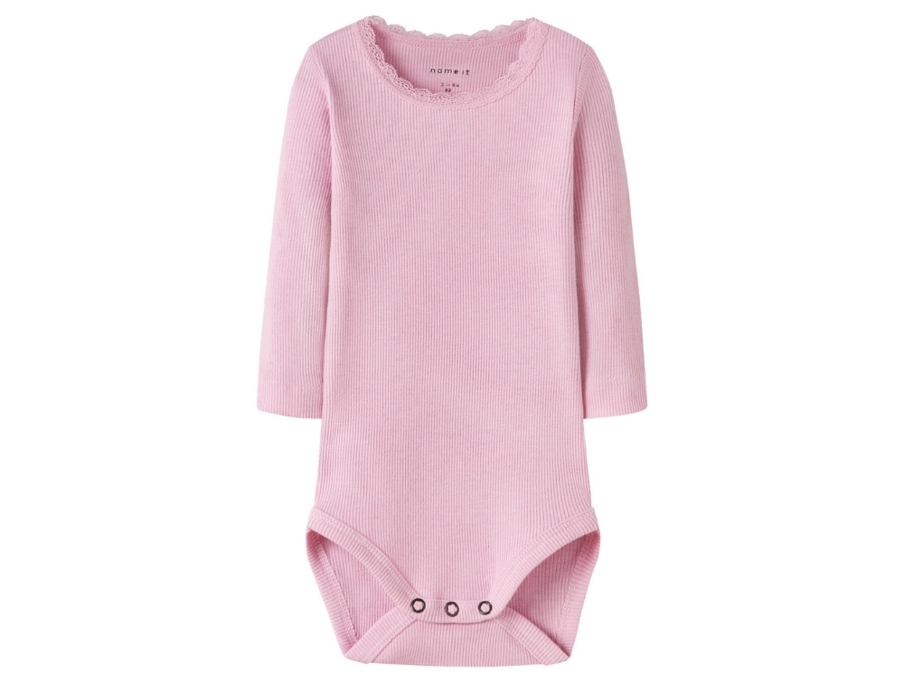 Rib-knit bodysuit from Name It in a soft pink shade with delicate lace trim at the neckline. A timeless style with long sleeves and a round neck, perfect for both everyday wear and special occasions.