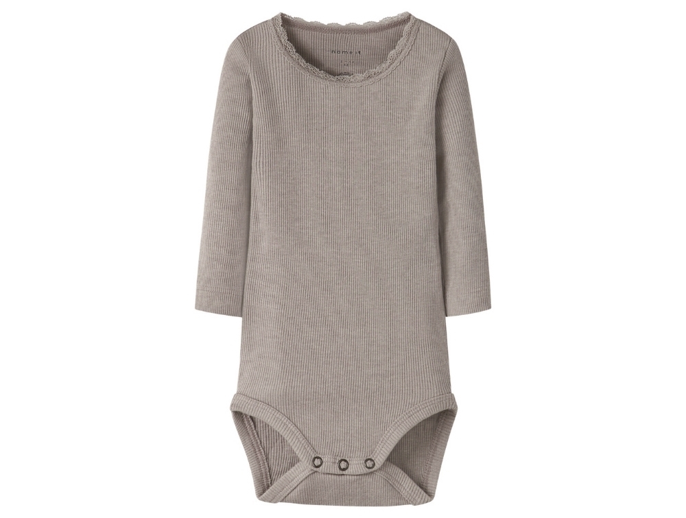 Ribbed bodysuit in grey shade from Name It with delicate lace trim at the neckline. A timeless everyday essential combining softness and a simple, elegant look.