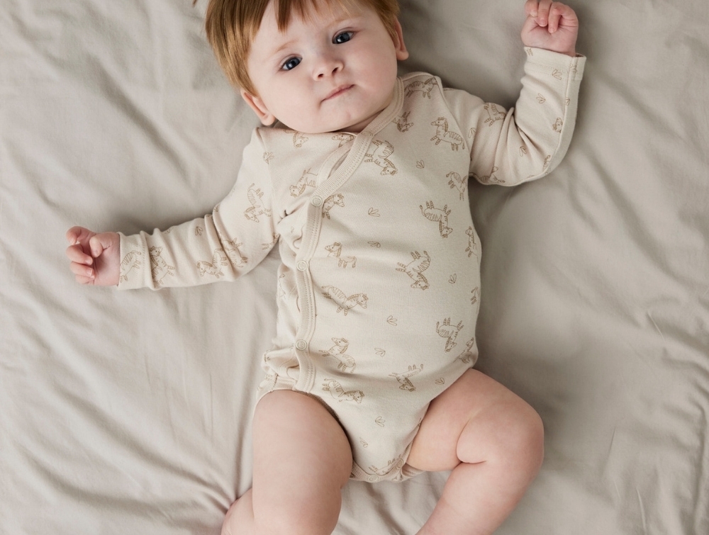 Made from a soft and stretchy cotton blend with organic cotton for a gentle feel against the baby’s skin. Perfect for everyday wear and sleep.