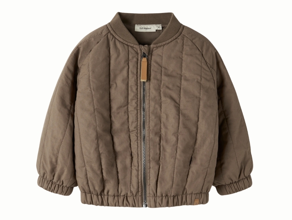 Bomber jacket in a brown shade (shitake) from Lil' Atelier with an embroidered bee motif on the back.