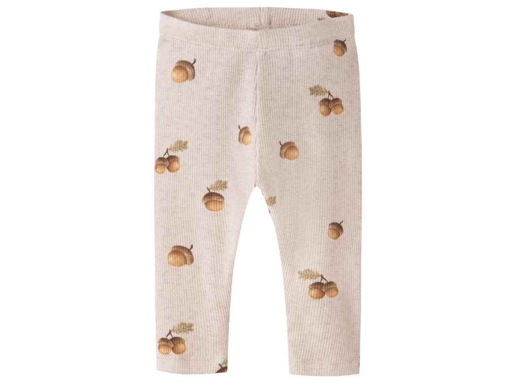 Leggings i beige nuance (peyote melange) fra Name It med sødt agernprint fordelt over hele stoffet.