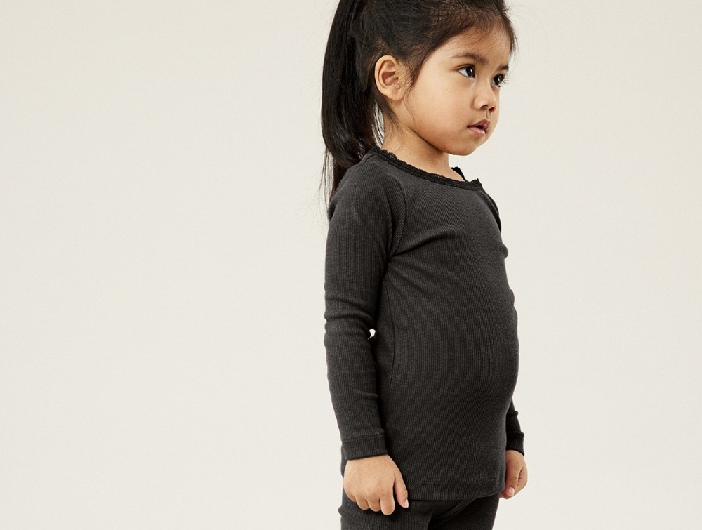 Rib top in black shade from Name It. A classic long-sleeved top made in soft, stretchy rib fabric with a round neckline and delicate lace trim for a feminine look.