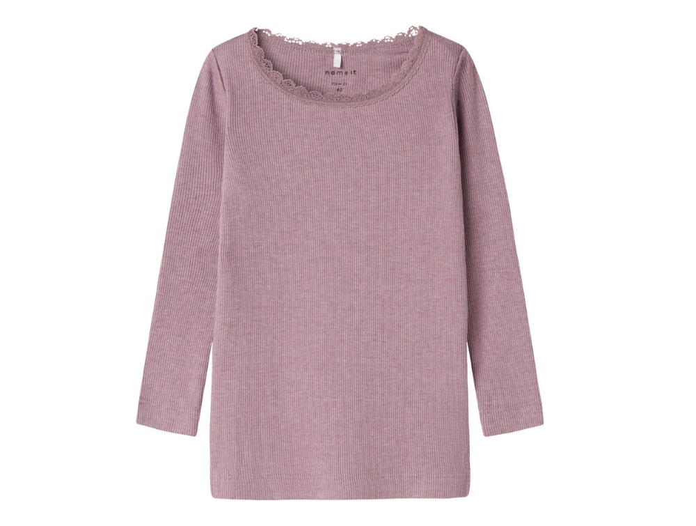 Rib top in dusty purple shade from Name It. A classic long-sleeved top made in soft, stretchy rib fabric with a round neckline and delicate lace trim for a feminine look.