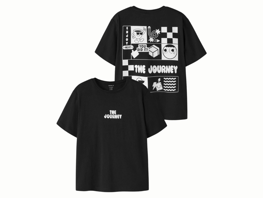 T-shirt in a black shade from Name It featuring a small “The Journey” text print on the front and a large graphic print on the back.