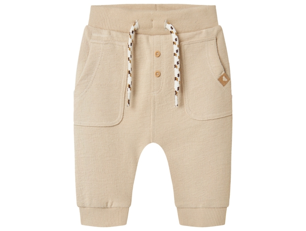 Trousers in beige shade (peyote) from Name It made from soft sweatshirt fabric with button and drawstring details at the front. A comfortable choice for everyday wear with freedom to move.