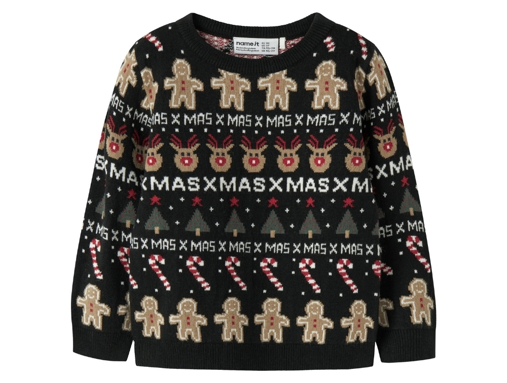 Christmas sweater in black from Name It with a festive jacquard knit featuring reindeers, Christmas trees, gingerbread men and candy canes.