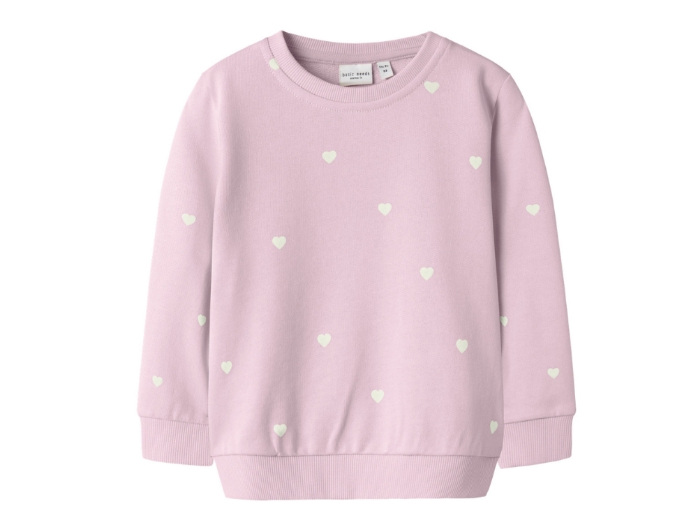 Sweatshirt in a soft pink shade (corsage) from Name It with small white heart print across the fabric.