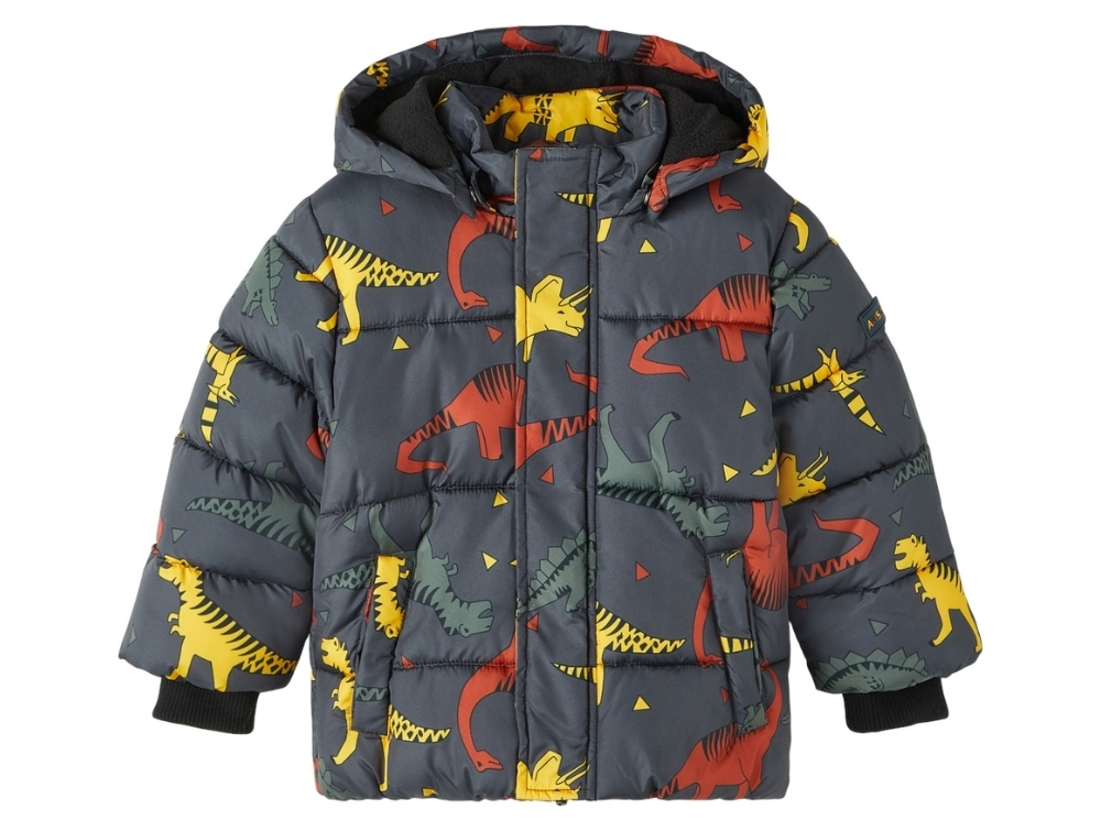 Winter jacket in puffer style, dark sapphire color with a dinosaur print from Name It.