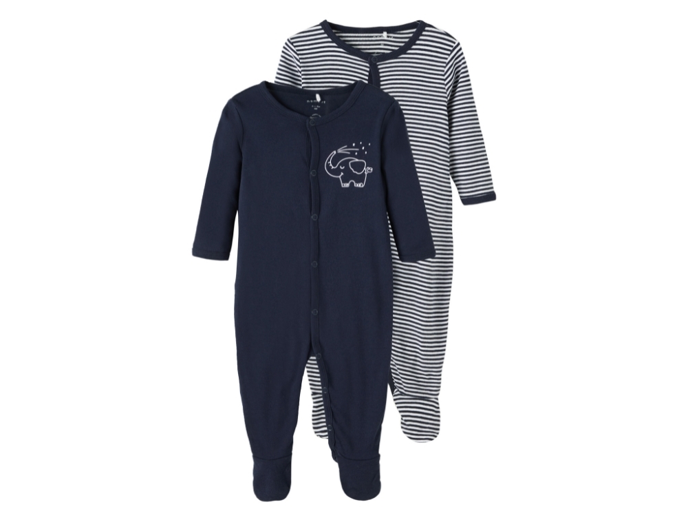 The package includes one solid-colored sleep suit with an elephant motif and one sleep suit with stripes.