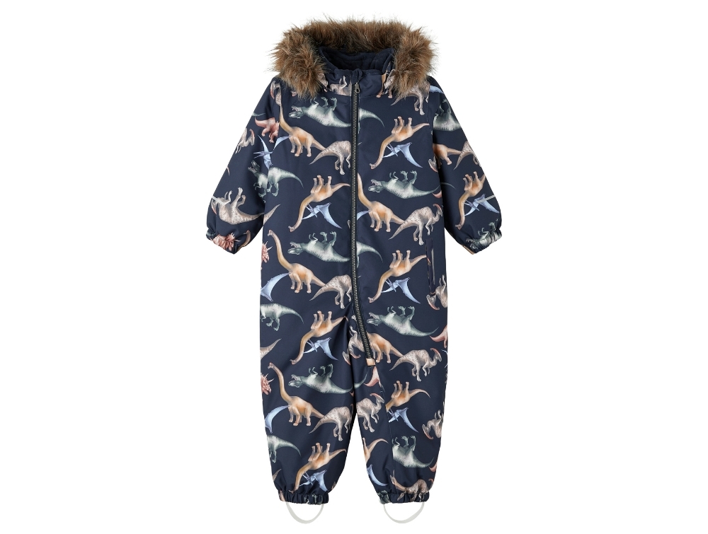 Snowsuit in the color dark sapphire with dino print from Name It. The jumpsuit has a detachable hood with faux fur with snap buttons.