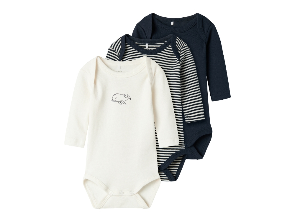 3 cotton bodysuits in the "dark sapphire" color theme from Name It.