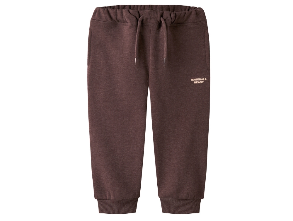 Sweatpants in brown shade (shaved chocolate) from Name It featuring a small “Baseball Beast” print on the thigh.