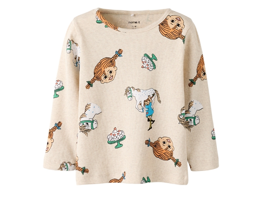 Beige ribbed long-sleeved top from Name It featuring a fun Pippi Longstocking print. A soft and stretchy jersey top perfect for everyday wear.