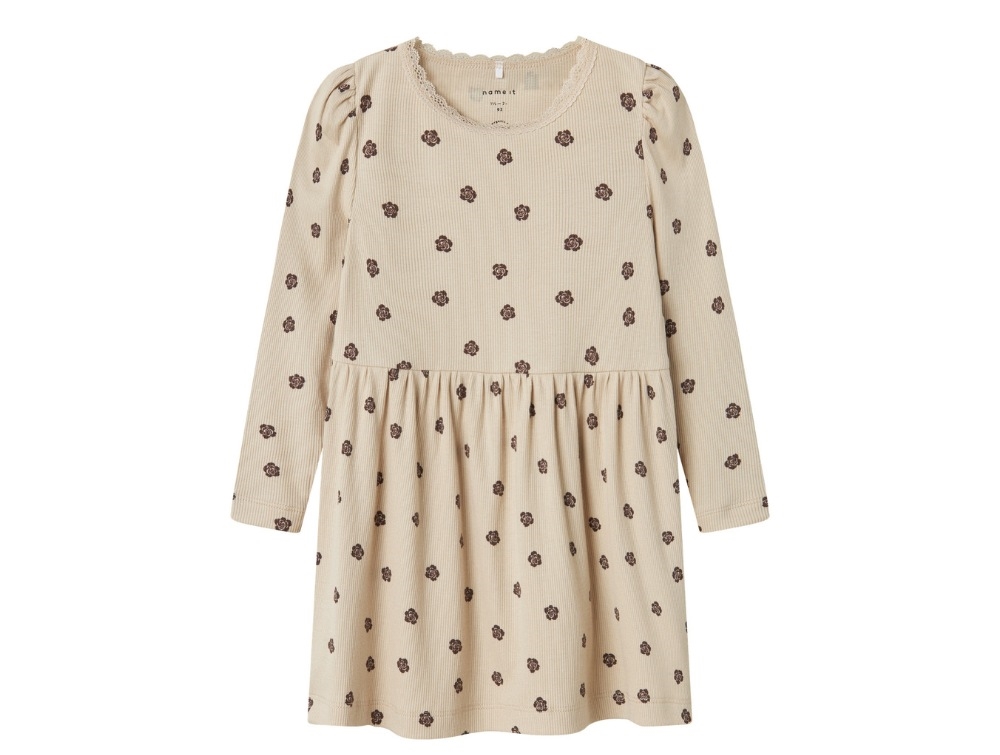 Cute beige dress (peyote) from Name It featuring a small brown floral print all over. The dress has long sleeves with a slight puff and a delicate lace trim at the neckline for a soft, feminine look.