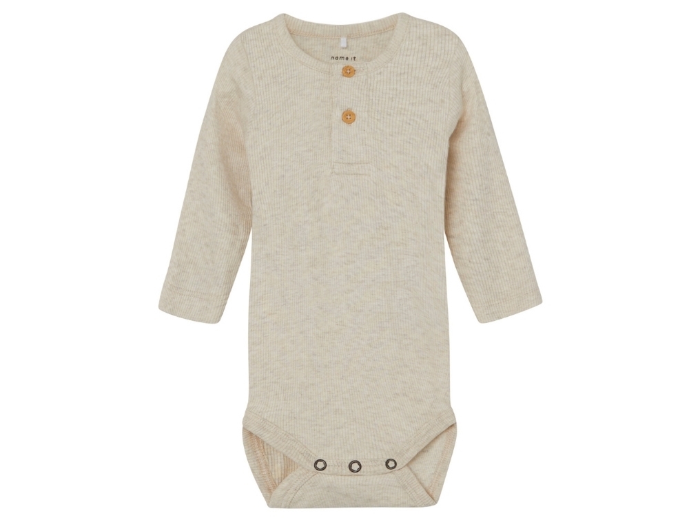 Ribbed bodysuit in a beige shade from Name It. The style features long sleeves, a round neckline and small wooden buttons at the front for a timeless look. The soft, stretchy fabric ensures great comfort all day long.