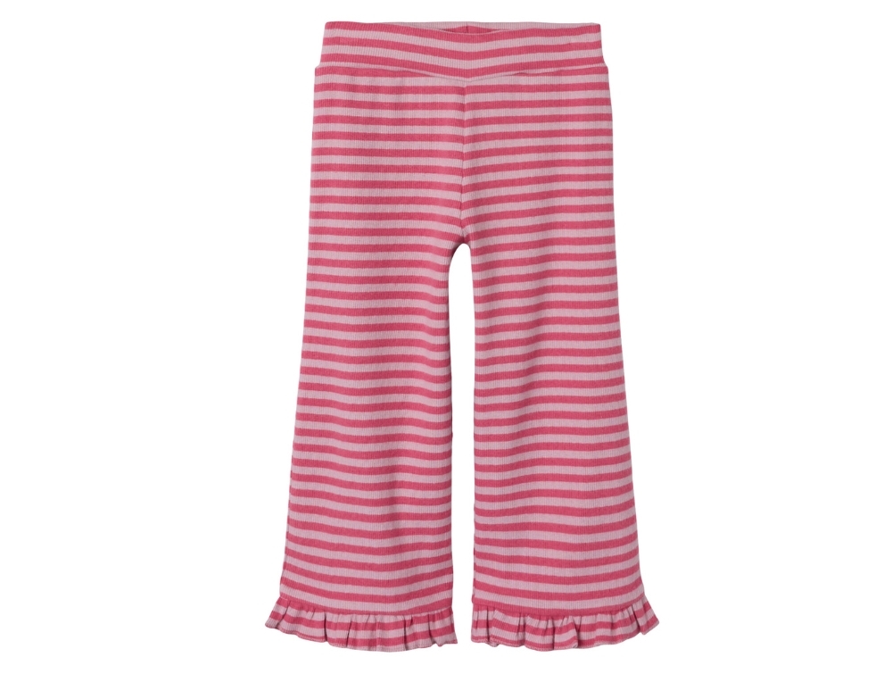 Cute striped trousers in pink and rose shades (burnished lilac rapture rose) from Name It. The trousers feature an adjustable elastic waistband and sweet frill hems for a feminine touch.