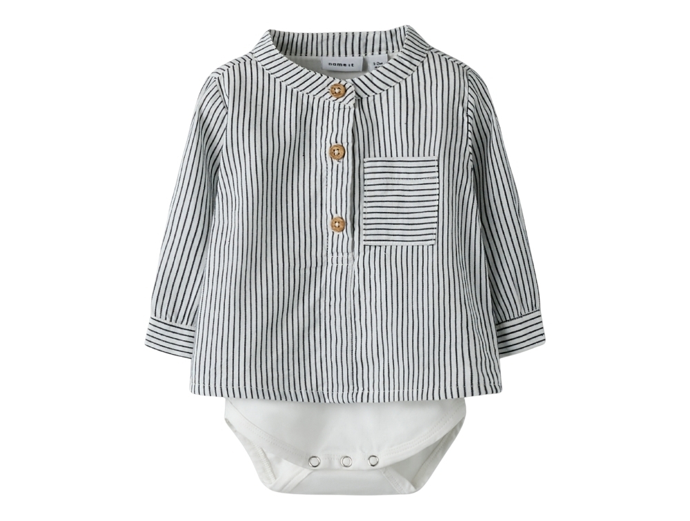 Shirt bodysuit in an off-white shade (Cloud Dancer) from Name It with narrow dark blue (navy blazer) stripes.