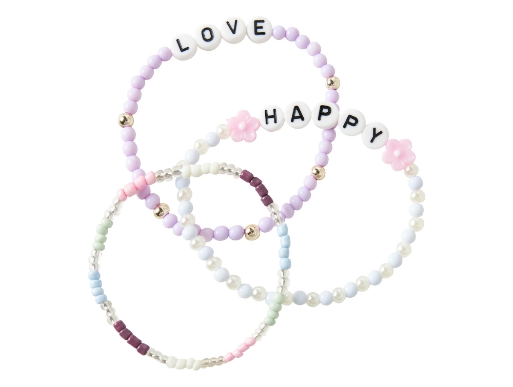 The bracelets are made with small plastic beads placed on elastic string, making them easy to put on and take off. The mix of beads, letters and small flower details creates a decorative look.