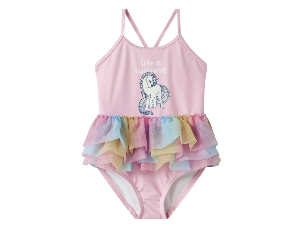 Swimsuit in a light pink shade (pirouette) from Name It with a unicorn print on the front and the text “like a unicorn”.