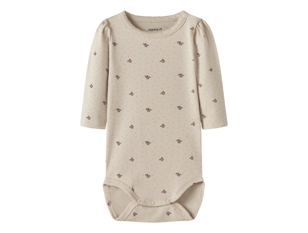 Bodysuit in a light off-white shade (almond milk) from Name It with small floral print and rib texture.