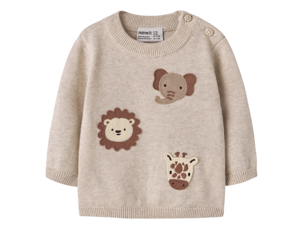 Knit pullover in an beige shade (Peyote Melange) from Name It with small animal motifs on the front.