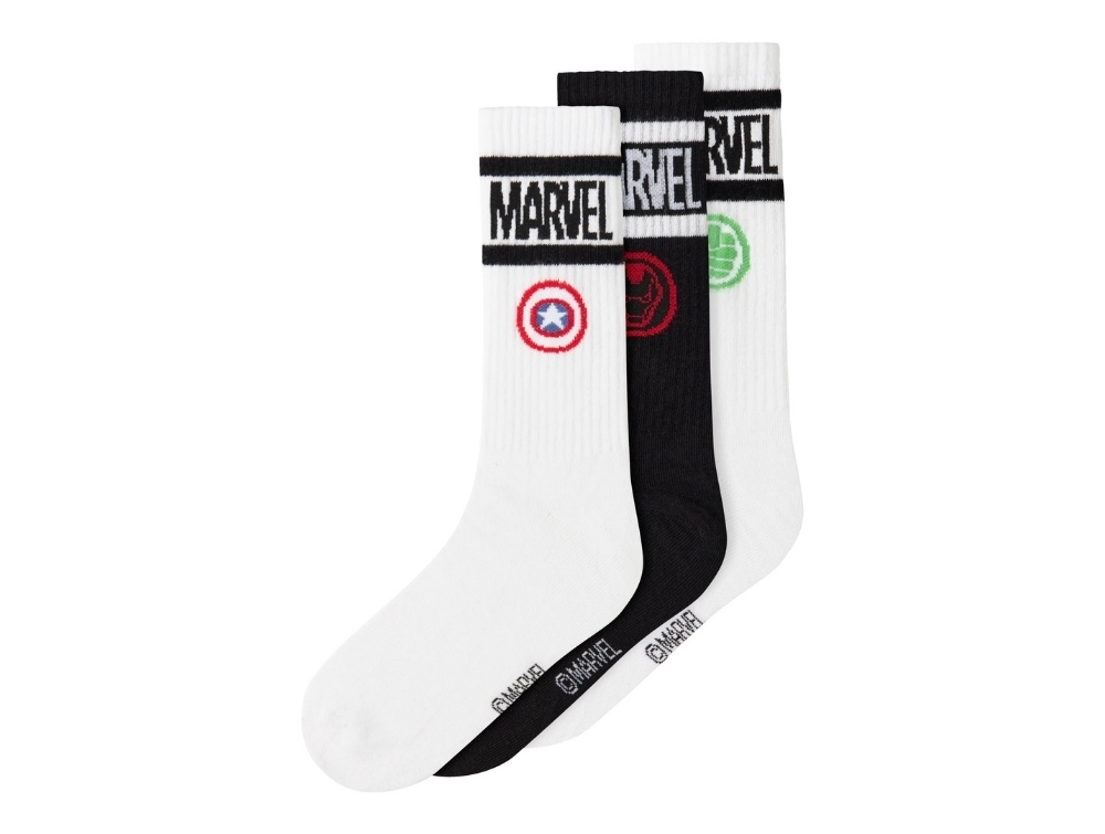 The design comes in a 3-pack with both white and black styles, all featuring Marvel logos and iconic symbols. Marvel is known for its superheroes and characters that have been part of popular culture for many years.