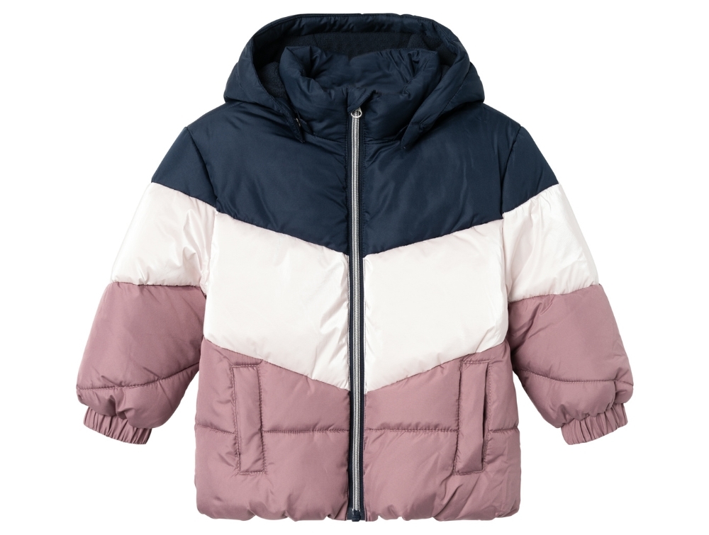 Puffer winter jacket in the grape shake color theme with a detachable hood with snap buttons from Name It.