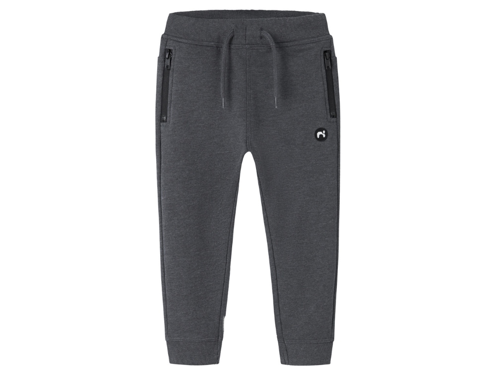Sweatpants in dark grey melange from Name It. Made in soft sweat fabric with a brushed inside for a gentle and comfortable feel. The trousers feature an elastic waistband with adjustable button and fixed drawstring for a secure fit.