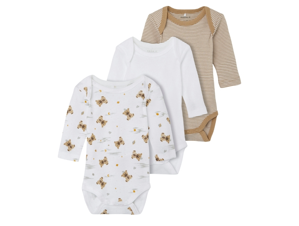 This package includes three cotton bodysuits in different colors and prints from Name It.