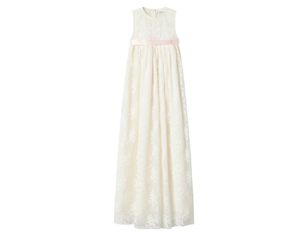 Christening gown in off-white from Name It. The dress features a delicate lace surface and a detachable satin ribbon that can be changed between pink and light blue.