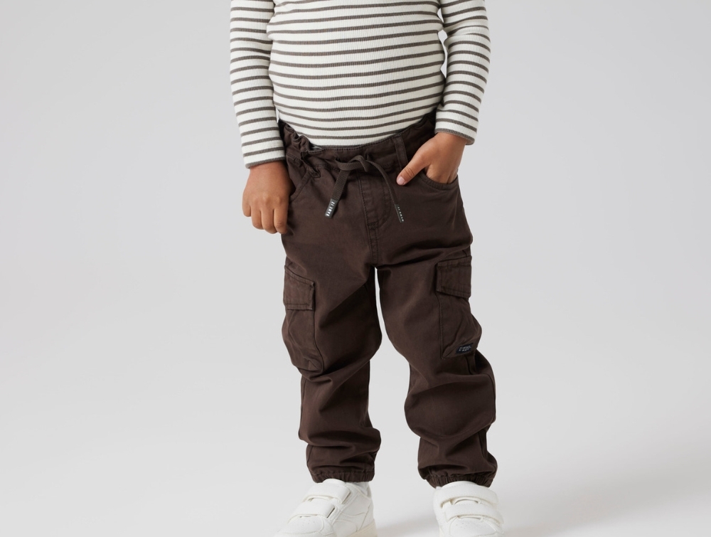 Cargo trousers in a dark brown shade from Name It. Made from durable twill fabric with elastic at the waist and ankles for a comfortable fit. A practical and timeless everyday style.