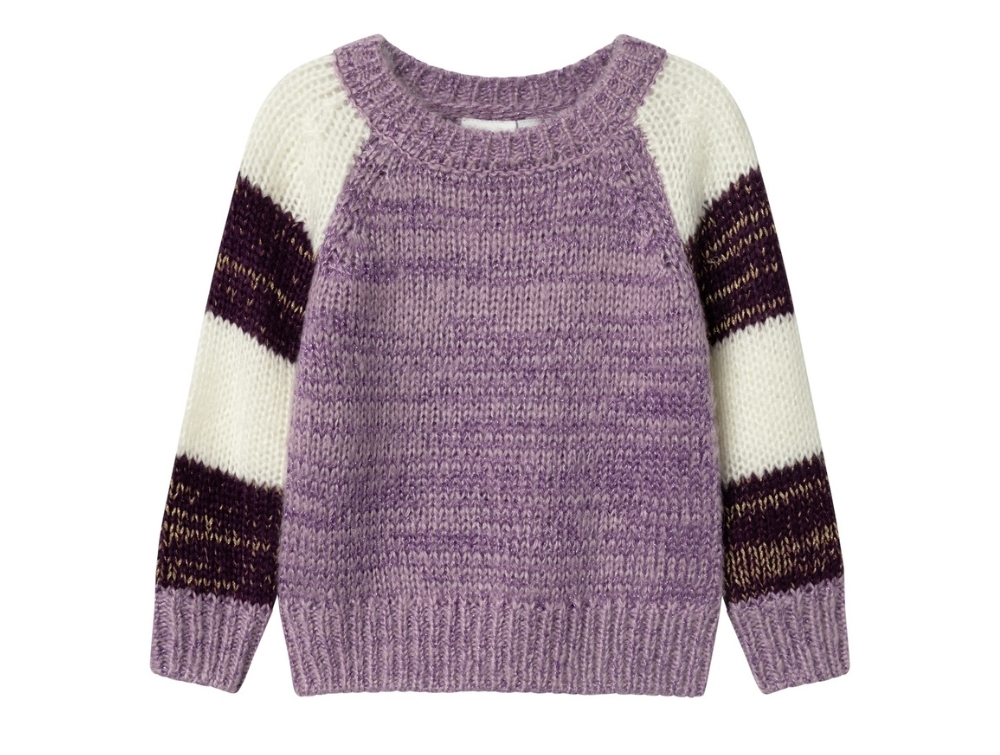 Lovely lavender mist-colored knit sweater with wide stripes on the sleeves and glitter threads from Name It.