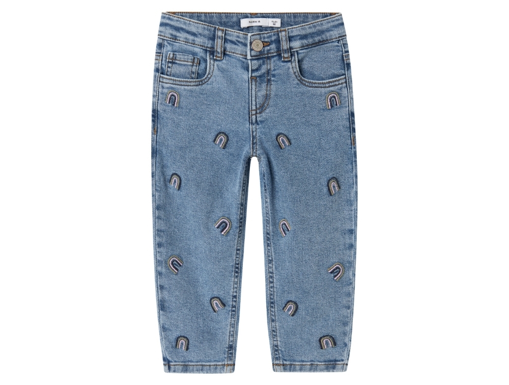 Blue denim jeans from Name It with cute embroidered rainbows all over. A playful design detail that adds a charming touch to a classic denim style.
